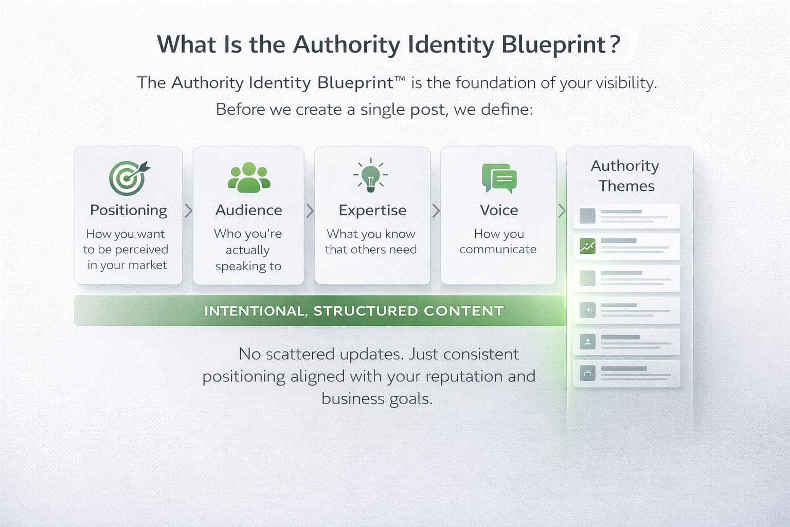 Before we post anything, we build your Authority Identity Blueprint.